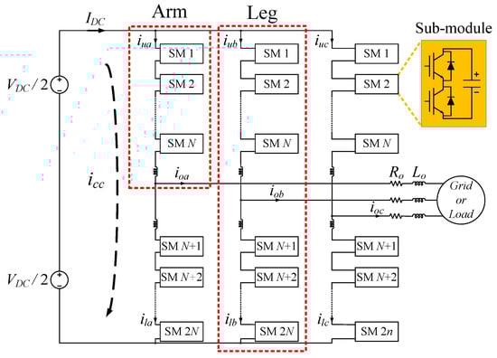 Modular multilevel converters (MMCs) have been proven to be suitable for high-power conversion systems, such as high- and medium-voltage direct current (HVDC and MVDC, respectively) transmission systems [1,2,3,4]. The MMC has many advantages, such as low voltage stress in the switching device, a small amount of electromagnetic interference noise, and high output quality (close to an ideal sinusoidal output waveform) [5,6]. To improve the performance and efficiency of the MMC, numerous methods have been employed such as capacitor-voltage balancing control [7,8], modulation schemes [9,10], fault tolerance [11], thermal modeling [12], and lifetime-prediction modeling [13]. HVDC and MVDC systems using MMCs operate in harsh environments, because they are exposed to the outside; and operating the MMCs for a long time increases the probability of failure. Additionally, because the MMC is applied to high-power transmission and distribution systems, considerable financial costs per hour are incurred during restoration when the system is shut down. Therefore, the reliability of the MMC with regard to the lifetime, maintenance cost, and robustness is becoming a crucial issue.