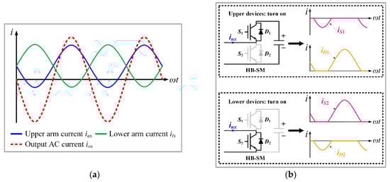 Arm current and upper-arm current flowing through the devices: (a) upper, lower, and phase currents; (b) upper-arm current flowing through the devices in the half-bridge submodule (HB-SM).