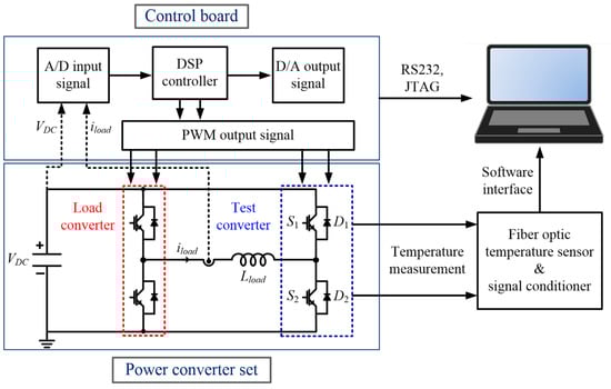 The configuration of the proposed simulator is shown in Figure 5. It consists of two half-bridge converters, a control board, a load reactor and temperature sensors. After removing gel inside the IGBT module, the temperature of the IGBT junction can be acquired by special instrumentation such as an IR camera or a fiber-optic sensor because insulation between the sensor and the power circuit is important for safe measurement. It is possible to effectively implement a temperature measuring experimental setup by using a fiber-optic sensor, which costs less than an IR camera.