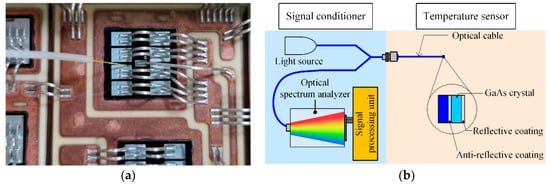 Measurement of the fiber-optic temperature sensor: (a) fiber-optic sensor mounted on the IGBT module; (b) temperature measurement principle of the OTG-F sensor.