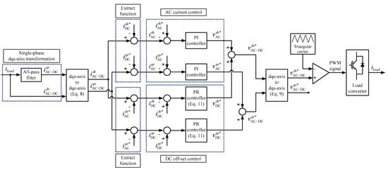 where and represent de-axis and qe-axis currents; and represent ds-axis and qs-axis currents, respectively; and ω represents the fundamental frequency of iload. The transformed AC component, , and DC component, , have physical DC and AC values, respectively. To extract and from the transformed current individually, the reference values of the DC and AC components ( and ) are subtracted from , respectively. The extracted AC component is compared with its reference value and the error between them is controlled to be zero using a proportional-integral (PI) controller. The extracted DC component current is controlled using a proportional-resonant (PR) controller.