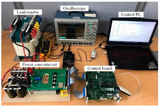 In practical applications of MMCs such as the HVDC and MVDC systems, each arm is composed of numerous SMs. Therefore, a high equivalent switching frequency can be obtained even though the device switching frequency is low. However, because the proposed simulator considers only one SM, the equivalent switching frequency is equal to the switching frequency of the test converter and the load converter. Therefore, the switching frequency should be selected with a high-speed frequency to realize the low THD of the load current, similar to that of actual MMCs. The load reactor is also designed to achieve a low THD of the load current with the selected switching frequency. For the proposed hardware simulator, the switching frequency was set as 10 kHz for both converters and the inductance of the load reactor was designed as 2 mH to achieve 2% of THD. The load reactor is composed of the copper coil and has the following specifications: a rating current of 40 A, and size of 195 × 300 × 230 mm. It is rather large because this reactor consists of three reactors, which are set as 1, 2 and 3 mH, respectively.