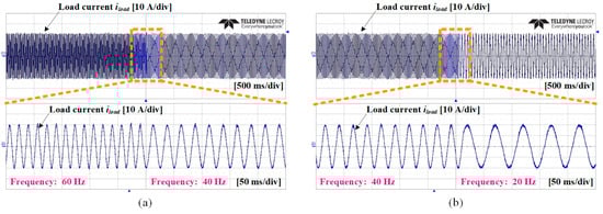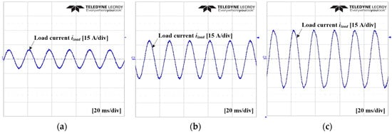 Figure 10 shows the experimental results for the amplitude control. The amplitude of the load current was controlled as 10, 20, and 30 A, as shown in Figure 10a–c, respectively. Figure 11 shows the frequency-control ability. The fundamental frequency of the load current changed immediately from the given reference value (from 60 to 40 Hz in Figure 11a and from 40 to 20 Hz in Figure 11b). The amplitude and frequency of the load current are important factors for the analysis of the thermal behavior in the IGBT module, as these components directly influence the junction-temperature swing. The desired amplitude and frequency of the load current depend on the load profile of the MMC for the specific application.