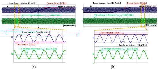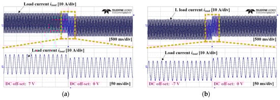 Figure 12 shows the experimental results for the DC-offset control. In Figure 12a, the DC offset of the load current is controlled from 7 to 0 A. In Figure 12b, the DC offset is controlled from –7 to 0 A. It was possible to completely simulate the arm current flowing to the SMs of the actual MMC by controlling the AC and DC components independently. Figure 13 shows the results for the power-factor control, which was investigated with variations in the power factor from −1 to 1. The power factor was controlled effectively with the waveforms of the voltage reference and load current and the phase delay between them. The load current flows through the IGBT chip and diode in the test converter, so the thermal characteristics can be analyzed by conducting load current through the IGBT module.