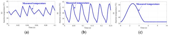 Figure 14 shows the measured temperature of S1 by using the fiber-optic temperature sensor. The fundamental frequency of the load current was controlled at 60, 20 and 0.1 Hz, as shown in Figure 14a–c, respectively. Due to the response time restriction of the temperature sensor, the thermal analysis was difficult at 60 Hz and 20 Hz, as shown in Figure 14a,b. In Figure 14c, the curve of the temperature variation is obvious and close to linearization compared to Figure 14a,b.