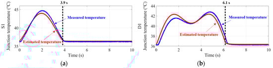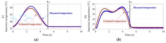 Figure 16 shows the measured and estimated temperature when the load current includes AC and DC components, like the arm current of an MMC. The AC component is controlled with an amplitude of 20 A and a frequency of 0.1 Hz. The DC offset is injected with the value of 7 A. The difference between the estimated and measured peak temperatures of S1 and D1 is similar to the results in Figure 15. However, the duration of temperature variation is not a half-period of the fundamental frequency because the load current includes the DC component as well as the AC component, as shown Figure 4.