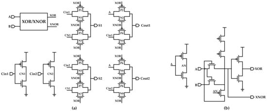 The paired full adders can be merged into a dual carry adder which is composed of an XOR/XNOR cell and two pairs of sum-carry cells. The schematic of the proposed dual carry adder cell is shown in Figure 1a. A and B represent common data inputs, while Cin1 and Cin2 represent different carry inputs. Hybrid logic is applied to the proposed dual carry adder as the hybrid logic full adder has been proved in previous work [15,16,17,18,19] to have a smaller area and lower power consumption than a conventional 28-T full-adder. The body of sum module and carry module are transmission gate-based multiplexers. The output of the XOR/XNOR is applied as the control signal of the multiplexers. Different input signals are given to the multiplexers according to different Boolean expressions. The schematic of the XOR/XNOR cell is shown in Figure 1b. The structure of the adopted XOR/XNOR cell is similar to that in Reference [19]. Hybrid logic is applied to realize high-speed and low-power XOR/XNOR operation.