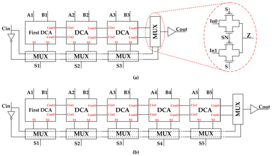 The single-stage CSLA with different bit widths consists of a different number of dual carry adders, while the correct sum and carry outputs are selected through multiplexers. Figure 3a,b show the architecture of 3 bit and 5 bit single-stage CSLAs, respectively. The carry output of the previous stage is connected to the carry input of the latter stage. The carry input can propagate to the carry output quickly due to the architecture of the dual carry adder. Only primary transmission gate delay is required for carry input to propagate to carry output in dual carry adder. The adopted multiplexer consists of two transmission gates to reduce delay and power consumption. In order to increase the drive capability of the carry output of single-stage CSLA, a buffer is added to the carry output. The buffer can also interrupt the possible long transmission gate path in multi-stage CSLA, since excessive long transmission gate chain can lead to a significant increase in latency.