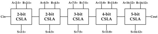 When single-stage CSLAs are cascaded into a multi-stage CSLA, the multipath carry propagation feature can be fully utilized in a SQRT structure. The SQRT structure balances carry propagation delay and delay of single-stage CSLA operation by gradually increasing the bit width of the cascaded single-stage CSLAs. The SQRT structure is applied to the proposed CSLA, and Figure 4 shows the architecture of a 16 bit CSLA which is composed of several proposed single-stage CSLAs. Similar to regular SQRT CSLA, the proposed CSLA divides the addition into sub-addition with different bit widths, and the bit widths of sub-addition increase by one progressively to balance carry propagation delay and delay of single-stage CSLA operation. For single-stage CSLA, once the bit width is increased by one, the delay is increased by one inverter delay and one transmission gate delay. For multi-stage CSLA, once the carry signal passes through a single-stage CSLA, the delay is increased by one transmission gate delay and one buffer delay. Thus, the increased by one method could balance carry propagation delay and delay of single-stage CSLA operation to a certain extent. At the same time, since the carry propagation delay is slightly larger than the delay of single-stage CSLA, the glitches of the carry signal can be reduced, and the power consumption is reduced. Eight-bit and 32 bit CSLAs are also implemented in this paper, and which are composed of 2b, 2b, 4b single-stage CSLAs and 2b, 3b, 4b, 5b, 6b, 6b, 6b single-stage CSLAs, respectively, to reduce the adder delay.