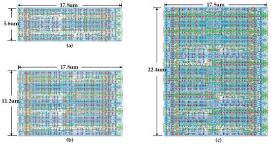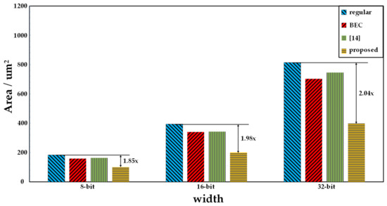 The layouts of the proposed 8 bit, 16 bit, and 32 bit CSLAs are shown in Figure 5a–c, respectively. The layouts can achieve nearly 100% utilization due to the regular structure of the proposed CSLA. The area of the proposed 8 bit, 16 bit, and 32-bit CSLAs were as compact as 99.68 μm2, 199.36 μm2, and 398.72 μm2, respectively. Actually, the average area of each bit of the proposed CSLAs with different widths was the same, 12.46 μm2. Figure 6 shows the area comparison among the four types of CSLAs. As shown, the regular CSLA had the largest area due to the excessive redundant structure. The BEC-based CSLA and the CSLA in Reference [14] used several methods to optimize the logic of the CSLAs, and the areas were somewhat lower than that of the regular CSLA. In this paper, with the employment of the proposed dual carry adder, the transistors required for addition were greatly reduced. At the same time, hybrid logic was adopted to reduce the overhead of the logic operation as much as possible. Thus, the area of the proposed CSLA was greatly optimized using the improved structure of the adder. The area of the proposed CSLA was reduced by nearly half compared with that of the regular CSLA as shown in Figure 6.