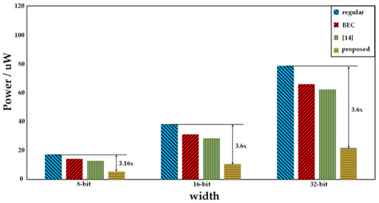 In order to verify the effectiveness of the proposed CSLA in reducing power consumption, benchmarks composed of 1000 pairs of random numbers were applied to the three types of CSLAs. Synopsys FineSim was employed to run the power consumption simulation. The simulation was performed at a speed of 100 M additions per second. Typical PMOS and typical NMOS were employed with a supply voltage of 1.2 V. Similar to the area comparison, the regular CSLA had the largest power consumption, as shown in Figure 7. The BEC-based CSLA and the CSLA in Reference [14] reduced some logic overhead compared with the regular CSLA, and the power consumption was slightly reduced. In this paper, the proposed dual carry adder reused as much logic as possible. Furthermore, the proposed dual carry adder mostly used transmission gate logic to minimize the power consumption. As shown in Figure 7, the power usage of the proposed CSLA was reduced by up to 72.2% compared with that of regular CSLA.