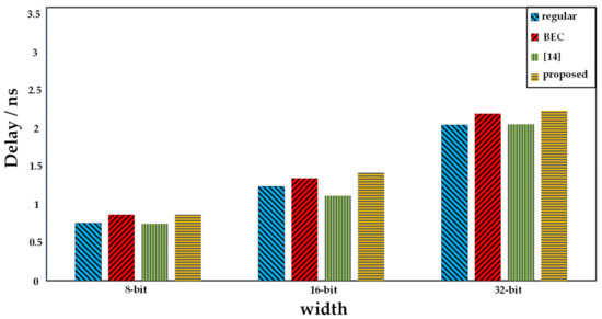 Fully custom CSLA cannot directly obtain the maximum delay of the circuit through the static timing analysis tool. It is also impossible for the large bit width full adder to traverse all possible inputs to obtain the maximum delay. Therefore, it is necessary to analyze the critical path of the circuit and give the excitation corresponding to the critical path to obtain the delay of the circuit. For the proposed CSLA, there are two critical paths that need to be considered. One is the carry propagation path through all single-level CSLAs, and the other is the operation latency of the last single-level CSLA, as discussed in Section 2.3. Several pairs of excitations have been applied to the proposed CSLA to measure the delay of the CSLA. Table 1 shows the excitations of the 16 bit CSLA, and the excitations of the 8 bit and 32 bit CSLAs were similar to those of the 16-bit. As shown in Table 1, the first three sets of excitations were designed to test the maximum carry propagation delay while the last three sets of excitations were designed to test the maximum delay of the single-stage CSLA. In order to test the maximum carry propagation delay, the carry signal needs to propagate from the first single-stage CSLA to the last single-stage CSLA in the first three sets of excitations. Similarly, the last three excitations test the maximum delay of the single-stage CSLA since the bit width of the last single-stage CSLA in 16 bit CSLA is 5. The maximum value of the delay obtained by the different excitations is considered to be the maximum delay of the circuit. All the initial values of the excitations were set to 0. Slow NMOS, slow PMOS, a temperature of 125 °C, and 10% supply voltage drop (1.08 V) were applied to the HSPICE simulation to get the worst-case delay. The same excitations were given to the regular SQRT CSLA, BEC-based CSLA, and CSLA in Reference [14] and their corresponding maximum delay for comparison. As shown in Figure 8, the delay of the BEC-based CSLA was slightly larger than the regular CSLA, as described in Reference [6]. The CSLA in Reference [14] skips the carry computation in the first stage of each bit-slice block, and the delay was reduced compared with the BEC-based CSLA, similar to that of the regular CSLA. The delay of the proposed CSLA was similar to the BEC-based CSLA and a little larger than the regular CSLA. Since the carry propagation delay was designed to be slightly larger than the single-stage CSLA delay to reduce glitches, the delay of the proposed CSLA can be reduced by increasing the bit widths of the cascaded single-level CSLAs and reducing the cascaded stages, which may slightly increase the power consumption.