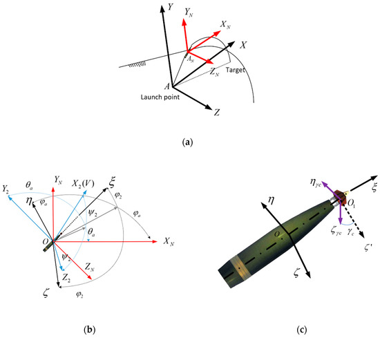 As shown in Figure 1a, the origin (denoted by ) of the launch reference coordinate system is located at the mass center of the projectile. points to the intersection of the ballistic plane and the horizontal plane, is orthogonal to and points upward, and is orthogonal to and , with the usual right-hand rule. By moving the launch coordinate system to the center of mass of the projectile, the launch-fixed reference coordinate system is obtained.