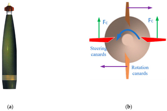 In the application of spin-stabilized projectiles, course correction fuzes (CCF) with fixed canards have been more widely applied than other actuators, such as pulse engines [6,7], movable canards [8,9,10], and inertial loads [11,12,13], as they are able to simplify the control system, reduce the space occupancy, and provide the required stable forces. Here, only the roll angle of fixed canards is required to be adjusted, such that control over the pitch and yaw motions of a projectile can be realized.