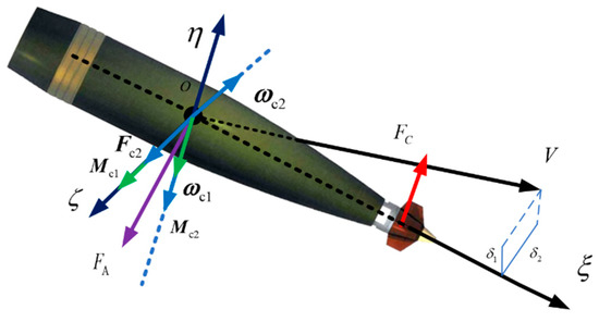 Similarly, this conclusion can be drawn from the analysis of the forces. Because and in the flight, the moment of momentum of the projectile is parallel to the axial direction. As shown in Figure 4, when , fixed canards produce an upward steering force, generating the pitch moment pointing to the right (defined in Figure 4). According to the theorem of the momentum moment, under the action of this moment, the projectile produces a downward swing angular velocity, , inducing the correct angle of attack. On the other hand, the right lift force, , induced by the right angle of attack, produces the downward moment , which could form a downward swing in the angular velocity, , thus producing a downward angle of attack. In conclusion, under the action of the upward steering force, the projectile would produce the angle of attack in downward and right directions. The final lift force, , is shown in Figure 4.