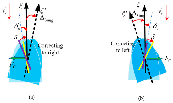 As shown in Figure 5, without the consideration of caused by gravity, is parallel to the axis of the projectile, and the deflection angle of the fixed canards is . In Figure 5a, for the coupling effects analyzed in last section, when the projectile corrects to the right, the fixed canards provide a steering force pointing to the left (). Then, for the influence of the steering force, the axis of the projectile swings to the right and . Similarly, in Figure 5b, when the projectile corrects to the left, the fixed canards provide a steering force pointing to the right (). Then, for the influence of the steering force, the axis of the projectile swings to the left and .