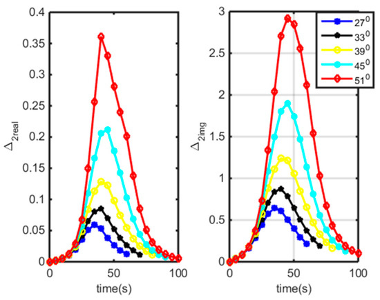 The intensive gyroscopic effect of spinning-stabilized projectiles would lead to a relatively bigger , the dynamic equilibrium angle caused by gravity, especially in the right direction. A simulation of is shown in Figure 6. It indicates that is much greater than , and that their time evolution maps are almost the same for different angles of fire. The greater the angle of fire is, the greater they are, and they reach a maximal value at the vertex of the trajectory.