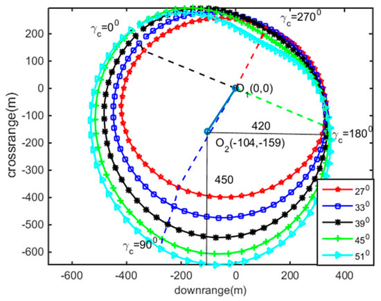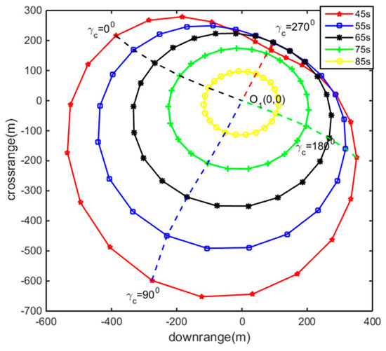 In the simulation, the correction process begins after the projectile reaches the vertex of the trajectory. In Figure 8, the ellipses in red, blue, black, and green present different groups of simulations, where the correction start times of which are 45, 55, 65, 75, and 85 seconds after the projectile reaches the vertex point, respectively. The roll angles of the fixed canards of each group vary from 0° to 360°, with a pace of 15°.