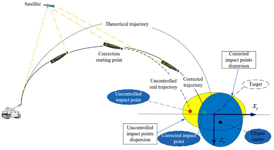 As shown in Figure 10, the conventional aiming method takes the real target position, denoted by the purple dot, as the aiming point. The dispersion area of the uncontrolled impact points is represented by the ellipse in yellow. The ellipse in blue is the area called the correction area, where the uncontrolled impact points can be corrected to the target, which means as long as the projectile is delivered to any part of this area, its in-air trajectory can eventually be corrected to reach the real target.