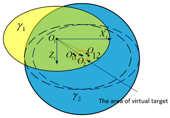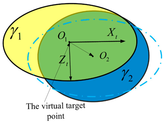 When , or , the area of the uncontrolled impact points cannot be fully covered by the correction ellipse. To make the correction ellipse cover the uncontrolled impact points area as much as possible, the virtual target is set to the center O2 of the correction ellipse , as shown in Figure 12.