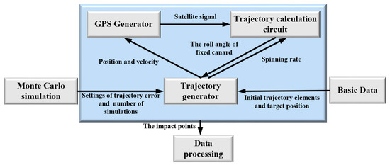 The experimental procedure is given as follows. First of all, after the trajectory generator receives the respective parameters, including the initial trajectory elements, target position, and Monte Carlo simulation data, the simulation starts with the control of the PC. Then, the trajectory generator sends real-time information, including the position and velocity of the projectile, to the GPS generator, and sends the spin rate to the trajectory calculation circuit within a period of 0.1 s. The GPS receiver processes the satellite signals from GPS generator and sends the navigation data to the trajectory calculation circuit. The trajectory calculation circuit calculates the roll angle of the fixed canards with the inputs of the navigation data and spin rate, sends this angle to the trajectory generator. The trajectory generator uses the roll angle of the fixed canards to generate the corrected real-time trajectory. When the process above ends at a trajectory height of 0 m, the trajectory generator sends the data of the impact point to the PC, and the next simulation starts immediately. When all of the simulations were finished, the data were processed by the PC.
