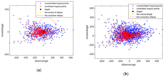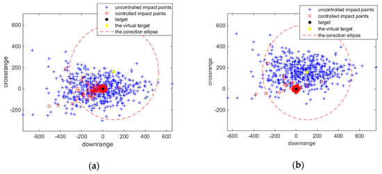The simulation results of Type 2 are shown in Figure 16. Compared with the traditional aiming method, there were more uncontrolled impact points located within the correction range when using the virtual target aiming method, which indicates that there are more uncontrolled impact points that can be corrected to the real target with this method. As show in Table 5, the CEP of the virtual target aiming method was 69.3 m, while the CEP of traditional aiming method was 90.75 m. The virtual target method can improve the striking accuracy by more than 20%.