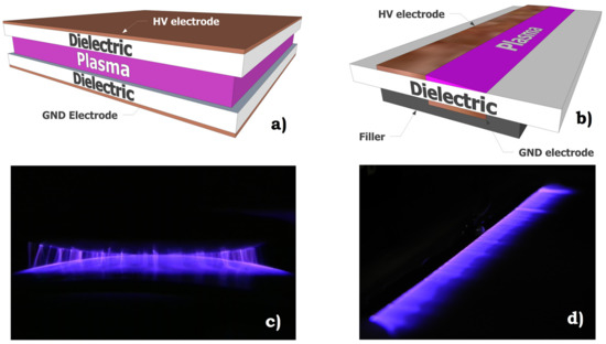 Typical (a) volumetric and (b) surface reactor sketches and corresponding images of a volumetric discharge with (c) hemispherical electrodes and (d) a surface dissymmetric discharge.