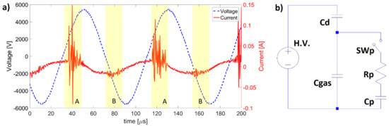 Plasma is macroscopically ignited twice each voltage period (A and B intervals highlighted in light yellow in the figure [10]. Within each of these time intervals, the plasma with a streamer nature appears (the red line of the current is no more sinusoidal in these intervals). Streamer (which is a plasma filament) repetition rate is usually in the range from 1 to 10 MHz with lifetimes of few tens of nanoseconds [1]. A simplified equivalent circuit of a DBD is presented in Figure 2b where Cd and Cgas are equivalent capacities of dielectric and gas gaps, respectively. The switch SWp is closed every time a plasma streamer is formed (i.e., in the MHz range). The presence of the plasma resistance Rp reflects average power used by the discharge to ionize the gas, the plasma capacity Cp takes into account the increase in the overall reactor capacity when the plasma is ignited [1]. This equivalent circuit is strongly capacitive with power factors typically below 0.05.