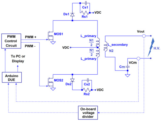 The PWM control signal is generated by a TL494 integrated circuit. IRF3415 MOSFETs have been utilized as switches. The micro-controller Arduino DUE is used both to regulate the switching frequency and to sample the two signals Vout and VCm. The former is varied by changing the value of a digital potentiometer connected to the oscillator frequency pin of the TL494 integrated circuit. The sampling circuit, the on-board voltage divider and the presence of the measurement capacitor Cm shown in Figure 3 will be described later on. Each primary winding is constituted by 7 turns (N1/2 in the figure), the secondary one by 1000 turns (N2 in the figure). The high-voltage winding is a commercial one, and it is insulated by means of a silicon rubber potting. The components Ds, Rs and Cs in Figure 3 constitute snubber circuits utilized to limit MOSFET overvoltages during commutations.
