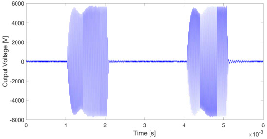 Another important feature of this power supply is the possibility to modulate the output voltage with on/off cycles. An example of on/off voltage modulation with on- and off times equal to 1 and 2 ms respectively, is presented in Figure 4. The plasma generation frequency has been set to 40 kHz. This means that for each on-time interval, 40 waveform cycles are generated. The figure shows a transient of about 500 μs after the switching-on phase and an almost negligible one after the switching-off phase. As already mentioned, this modulation strategy is a key-role parameter in several research and industrial applications to achieve both effective and efficient treatments.