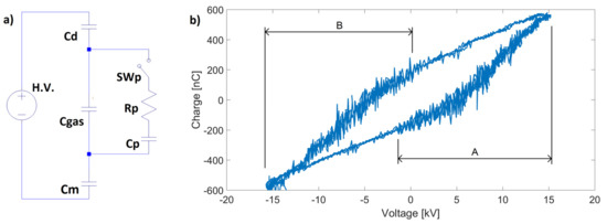 The last integral represents the energy delivered to the discharge in one waveform cycle and can be calculated as the area enclosed by the Vout–Qm curve in the Lissajous diagram. As far as this is an integral method, the requested sample rate is the same used for the applied voltage Vout. Thus, the micro-controller can be used to evaluate the average power when the Lissajous figure technique is used. In Figure 5b, an example of Lissajous figure is displayed. Regions “A” and “B” correspond to the time intervals in which the discharge is ignited (see Figure 2a). As far as the slope of the Lissajous curve is equal to the equivalent capacitance of the load, it is possible to note that the equivalent capacitance of the reactor when the discharge is ignited (“A” and “B” intervals), is about twice the equivalent capacitance without the presence of plasma. This behavior was already introduced when the equivalent discharge circuit was introduced in Figure 2b.