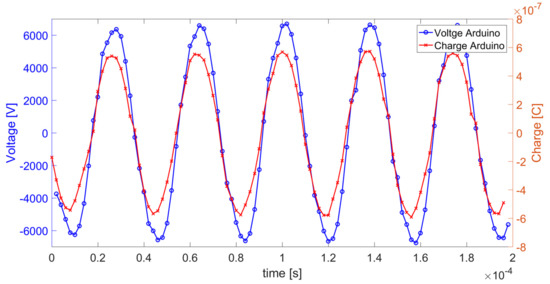 A series of measurements has been carried out to test the reliability of the average power evaluation performed by the micro-controller. The average power feeding the volumetric reactor has been calculated with the Q-V Lissajous technique, both by means of the micro-controller coupled with the generator on-board diagnostics, and by using a dedicated measurement setup. This is constituted by a Tektronix P6015 capacitively compensated high-voltage probe with a bandwidth up to 75 MHz to measure the high-voltage signal and a Yokogawa low-voltage probe with 75 MHz bandwidth to measure the voltage drop across Cm capacity. Both signals have been acquired by a Yokogawa DL1740 4-channel, 500 MHz bandwidth, 1 GS/s oscilloscope. In Figure 6 the high voltage and charge supplying the DBD reactor as a function of time, acquired by the micro-controller, are shown. In this example the switching frequency has been set to 25 kHz. As far as the sample rate is 500 kHz, each waveform period is acquired by means of 20 samples.