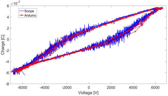 Q-V Lissajous figures detected by means of the dedicated measurement setup (continuous blue line) and by means of the micro-controller (red line with circles).