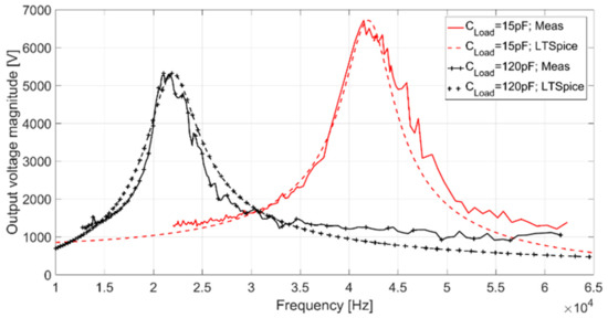 Experimental results and simulations are in a very good agreement, underlying the validity of the simplified model used in LTspice. Depending on the load capacity, a different resonance frequency can be observed. As far as the transformation ratio of the transformer is about 143, at the resonance frequency the output voltage supplied by the generator strongly increases maintaining the same input DC voltage. As expected, by increasing the load capacitance both the resonance frequency and the output voltage decrease.