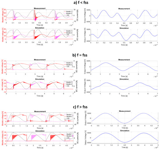 In Figure 9a a comparison between measurements and simulation results is shown. On the left-hand side low voltage quantities as MOSFET voltages and bus DC current are shown. On the right-hand side output voltage is presented. This comparison is carried out for frequencies less than, equal to and greater than the soft switching frequency (fss), at a fixed input DC voltage equal to 10 V and a reactor capacitance of 15 pF. As it has been shown for the results in Figure 8, an overall good agreement between measurements and simulations have been obtained.