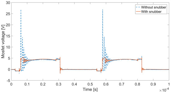 MOSFET voltages without (dashed blue line) and with (continuous red line) the snubber circuit.