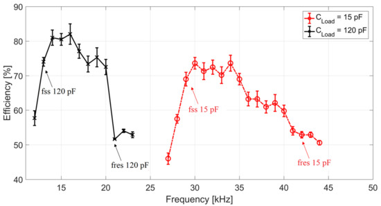 The generator efficiency as a function of the switching frequency is shown in Figure 11 for both reactors. Soft switching and resonance frequency (fss and fres, respectively) are displayed in the figure for both reactors. The efficiency trend is quite similar for both loads. It is possible to notice that, by working below the soft switching value, quite low efficiency is measured. At the soft switching frequency, a considerable increase of the efficiency is achieved. By further increasing the switching frequency, a plateau of the efficiency value is reached. Then, approaching the resonance frequency, the efficiency decreases. At the resonance frequency a sudden decrease of the efficiency is obtained. By further increasing the frequency this low value is maintained.