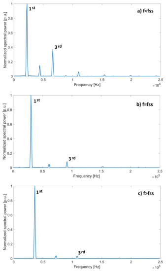 The FFT is calculated with a native Arduino library and allows finding the soft switching frequency. In the right-hand side of Figure 9, output voltages with frequencies less than, equal to and greater than the soft switching value have been shown. Normalized FFTs of these signals, determined by means of the micro-controller, are displayed in Figure 12.