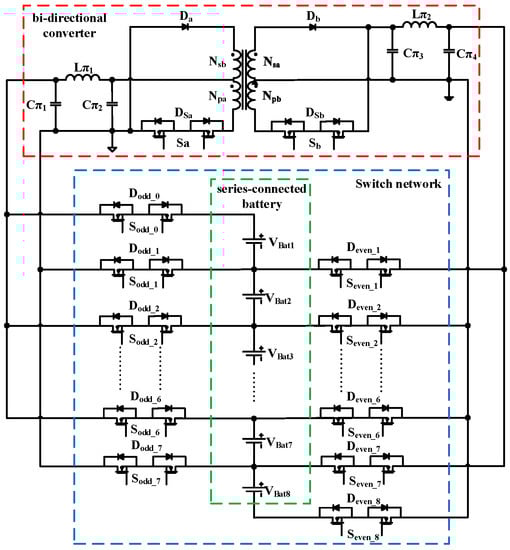 As shown in Figure 1, the proposed balancing method utilizes a bi-directional converter [,] to balance the voltage of each cell in a battery string. This method helps to deliver the energy from higher-voltage battery to lower-voltage battery directly. In other words, there is no more energy loss during the delivering process, and this technique can also shorten the balancing time effectively. In this study, the forward converter has good isolation feature and simple structure for bi-directional function. The strategy is to balance the voltage between the odd-numbered battery and the even-numbered battery which exist maximum differential voltage in the battery string. The switch network shown in blue dotted block is formed by several couples of MOSFETs with back-to-back connection, and each connection also becomes a bi-directional switch set with two MOSFETs which is connected with the cell. Hence, this connection can provide a bi-directional path to deliver the energy. In addition, each of the bi-directional switches set can avoid the other currents flowing through the cell during the balancing process.