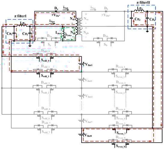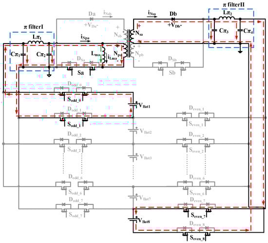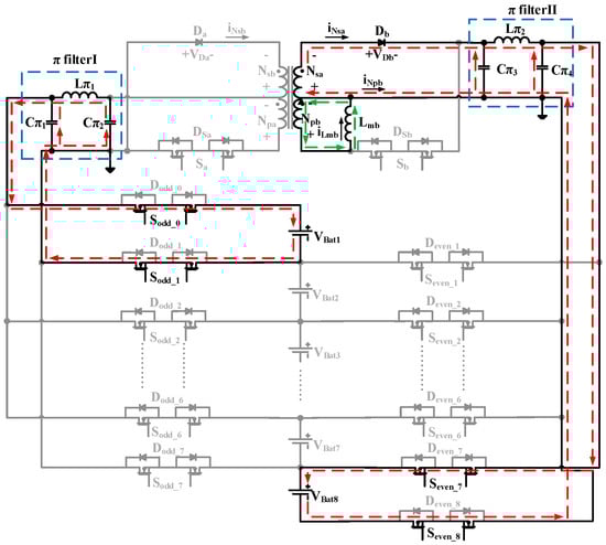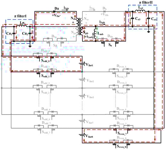 As shown in Figure 6, the bi-directional switch set Sb, Sodd_0, Sodd_1, Seven_7, and Seven_8 are all turned on. The others are all turned off. The current from VBat8 will charge to Lmb through π filter II and also deliver the energy from the primary winding Npb to the secondary winding Nsb. In this transferring state, Da is turned on, and iNsb starts to charge to VBat1 through π filter I. The charging path is shown in red-dotted current.
