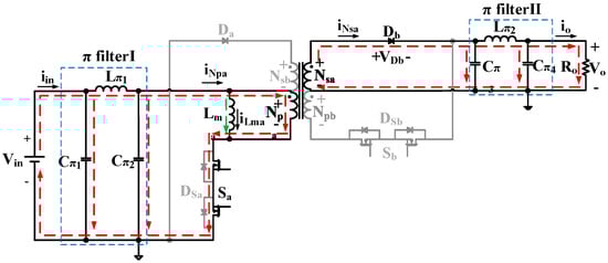 The turns ratio can be derived by the voltage of the charging behavior. Refer to Figure 8, Vin is fed in π filter I, and the voltage across the primary side NPa is also the Vin (assuming the filters and the switches are ideal). At the secondary side, the voltage VNsa across NSa is induced by NPa. During the charging state from Vin to Vo, the condition has to be satisfactory to turn on the diode Db. Therefore, the charging path can be established as red dotted current.