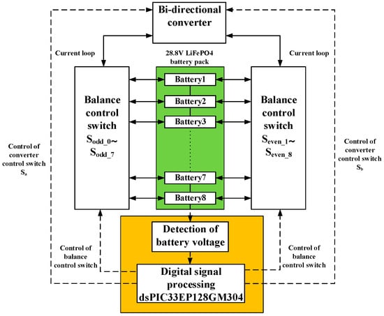 The main digital controller utilized in this proposed structure is dsPIC33EP128GM304 from Microchip Technology. The first step of the procedure is to sense the voltage of each battery by the voltage detector circuit and to send the information to the processor with A/D converters. After analyzing from the processor, the battery cell in the string which needs to be activated for balancing will be chosen by the processor. In other words, the related switches (S1, S2, Sodd_0~Sodd_7, and Seven_1~Seven_8) around the imbalanced battery cells will be turned on or off for balancing process. Figure 9 shows the structure of the proposed fast battery charging balancing circuit.