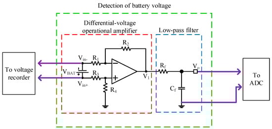 In the balancing process, the voltage of each cell will be kept detecting and measuring all the time. In order to sense the voltage of each cell precisely, and to avoid the load effect between the cell and the input of the analog to digital converter (ADC), the detection circuit for battery voltage is adopted. From Figure 9, the detection of battery voltage is composed of a differential-voltage operational amplifier (OPA) and a low pass filter (LPF) to achieve the voltage measurement of a cell. The function of LPF is to filter the high frequency noise at the output of OPA. Then, the output of LPF will connect to the ADC’s input of the MCU. In facts, the charging voltage of cell, VBat is 3.6 V, but the maximum input voltage of the ADC is 3 V; therefore, the proportion of the resistors around the OPA needs to be considered (R1 = R3, R2 = R4) for full scale voltage as shown in (7). In this circuit, the LPF has no attenuation in low frequency. Thus, . In the meanwhile, the voltage of cell can also be measured by the voltage recorder. The detection of battery voltage circuit is shown in Figure 11.