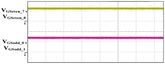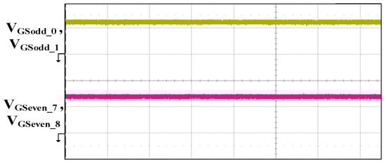 Experiment of VGS triggering waveforms for turning on the switch network (VGSodd_0, VGSodd_1, VGSeven_7, VGSeven_8), VGSodd_0, VGSodd_1, VGSeven_7, VGSeven_8: 10 V/div, Time: 20 µs/div.