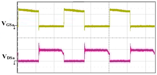 Experiment of voltage waveforms of Sa (VGSa, VDSa), VGSa, VDSa: 10 V/div, Time: 20 µs/div.