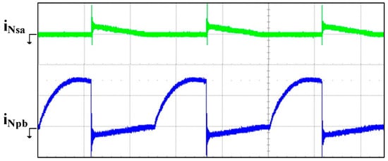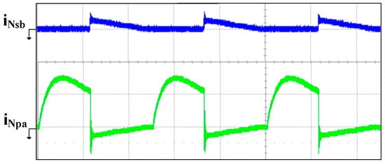 Experiment of current waveforms (iNsa, iNpb), iNsa, iNpb: 500 mA/div, Time: 20 µs/div.