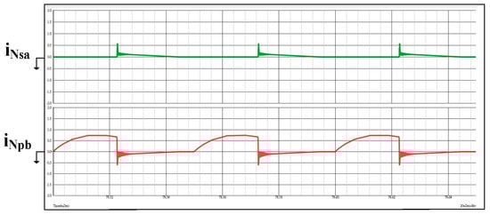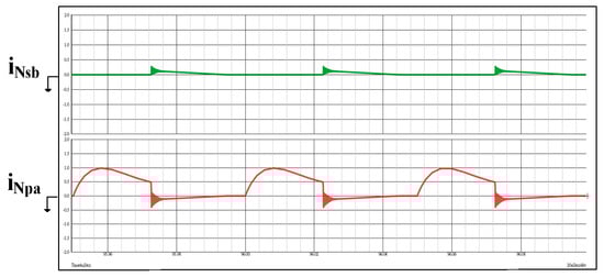 Simulation of current waveforms (iNsa, iNpb), iNsa, iNpb: 500 mA/div, Time: 20 µs/div.