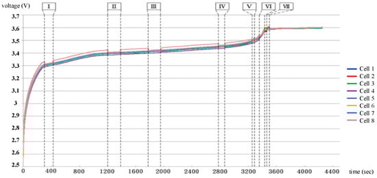 Before the balancing process starts, each of the battery cells has been discharged for test and experiment. The open loop voltage of each cell is listed in Table 3 from VBat1 to VBat8 individually. When the cell is being charged with 1C current, the △V is set for 0.03 V during the balancing interval I to IV. If the voltage reaches to 3.5 V, the △V is set from 0.03 V to 0.02 V during the balancing interval V to VII. As the battery voltage rises from 3.5 V to 3.6 V at interval V, the main concept of choosing △V is set for lower voltage to make the balancing process much more precise. During the experiments, the voltage and the curve of each cell is measured and drawn by a voltage recorder (model number: midi LOGGER GL800, manufacture: GRAPHTEC).