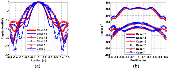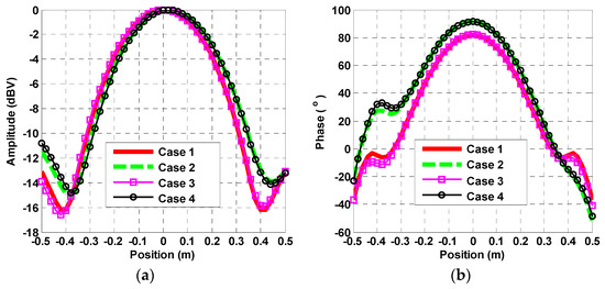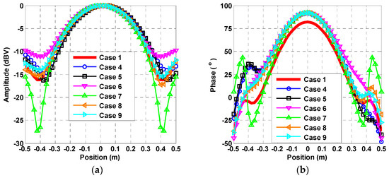 In this paper, 13 cases with different feed errors and different observation positions are presented in Table 1, and all the near-field radiation characteristics were calculated in the positions of x ∈ [−0.5 m, 0.5 m] and y = 0. The origin of coordinates is the location of the aperture center. The effects of errors 1 on the near-field amplitude and phase distributions are illustrated in the Figure 5a,b, respectively. As shown amplitude and phase distributions are illustrated in the Figure 5a,b, respectively. As shown in Figure 5a,b, by comparing case 1 (without errors) and case 2 (with amplitude and phase errors 1), the large amplitude deviations and phase deviations were found to appear in the edge of the x direction. It is clear that the results of case 3 (just with amplitude error 1) are very close to case 1 (without errors), and the results of case 4 (just with phase error 1) are very close to case 2 (with amplitude and phase errors 1). The conclusion is that the phase errors lead to more serious effects on the near-filed distributions than amplitude errors. The effects of different phase errors on the near-field amplitude and phase distributions are presented in Figure 6a,b, respectively. It depicts that the maximum amplitude deviation of about 12 dB and the maximum phase deviation of about 50° appeared in case 7 with phase error 4.