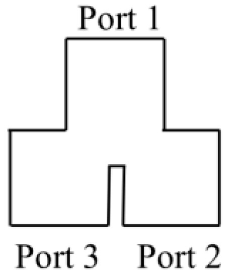 The H-T junction (i.e., a T-junction in the H-plane) is a waveguide that is divided into a two-way waveguide in the H-plane [18,23]. The Y-junction is a more compact structure than an H-T junction in applications, and is shown in Figure 8. When the TE10 wave was transmitted into port 1, the equal-amplitude and phase TE10 wave was output from port 2 and port 3. Therefore, the Y-junction is suitable as a power divider and combiner. Due to the two branches being folded in the same direction, the transition section between the main waveguide and branch waveguides will widen. This structure would lead to higher order modes (e.g., the TE20 mode), thus the matching becomes worse. The width design of the transition section is important, as it will suppress the higher order modes and broaden the bandwidth [24,25].